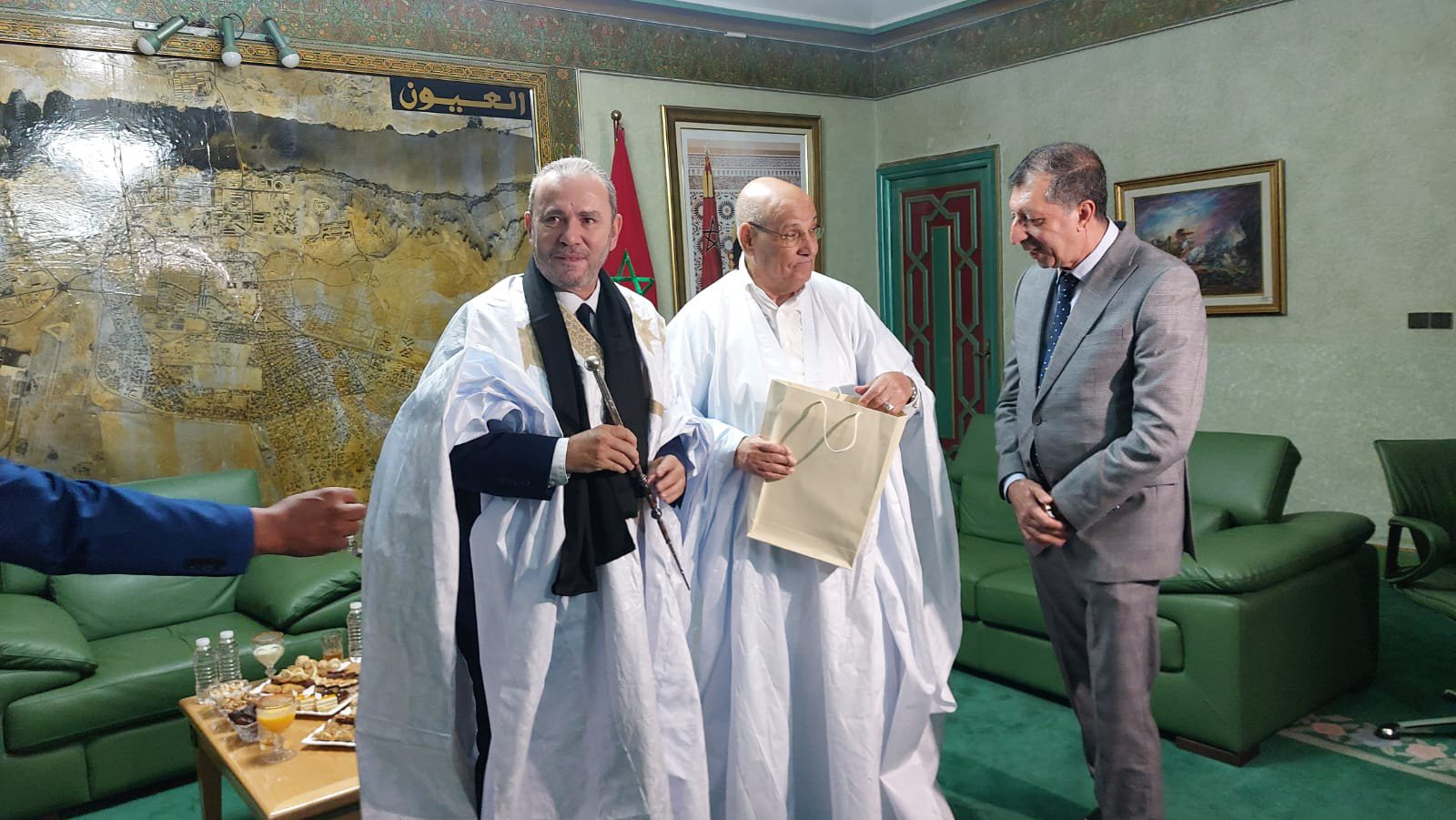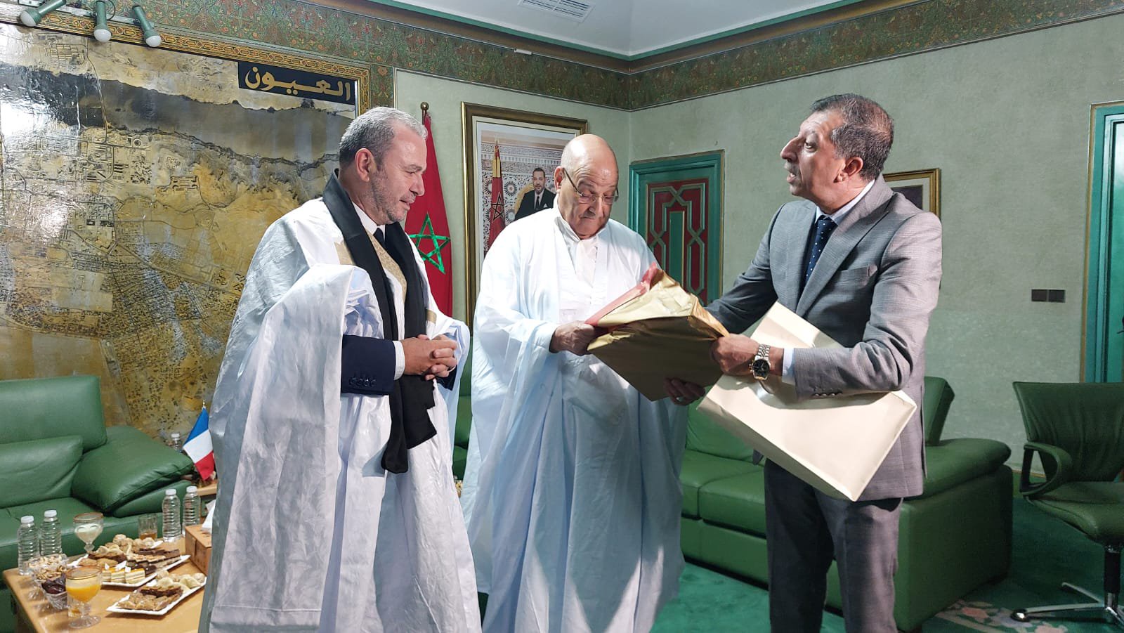 قام رئيس جماعة العيون حمدي ولد الرشيد، بتقديم هدية للسفير الفرنسي بالمملكة المغربية، كريستوف لوكورتييه عبارة عن “الدراعة” الزي الصحراوي التقليدي الذي تمتاز به الأقاليم الجنوبية.
